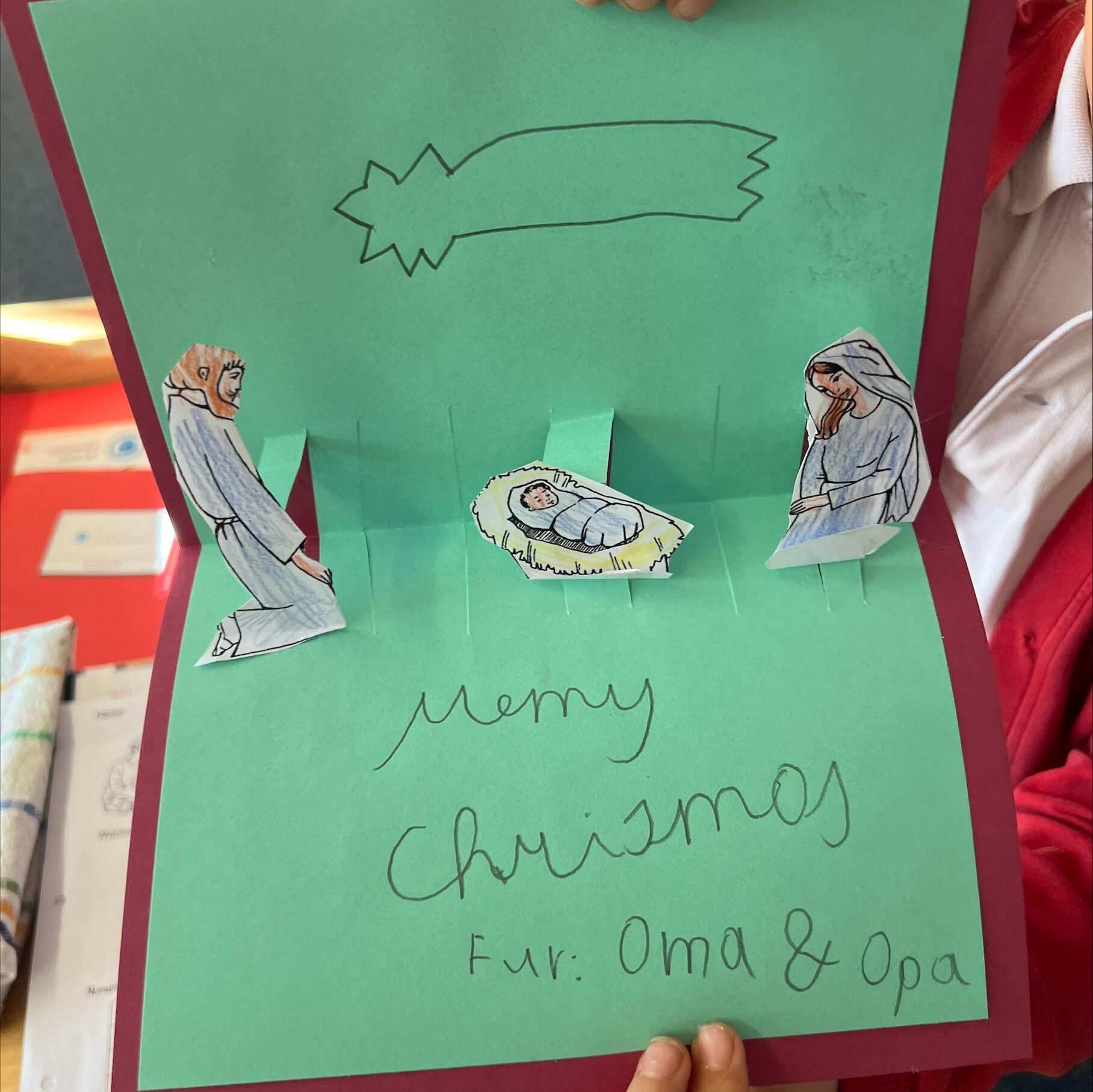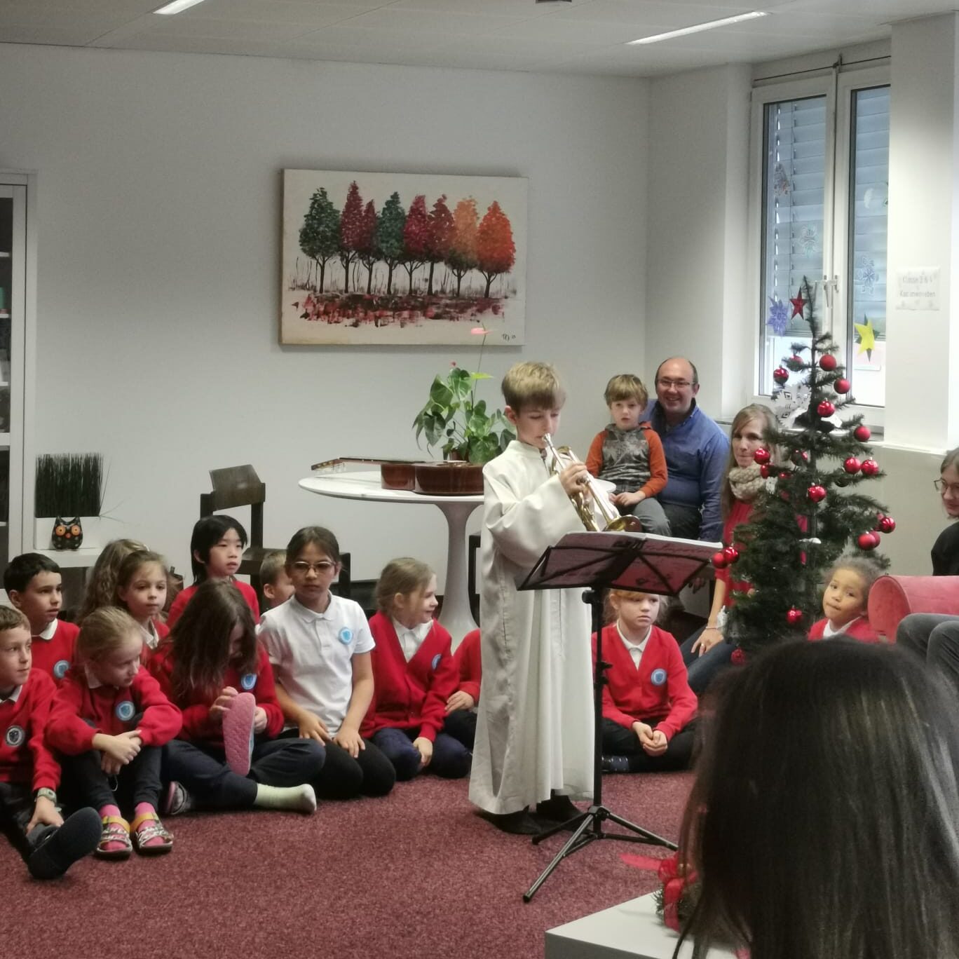 Neben Kekse-Essen, Weihnachtsbasteleien und der Adventmesse bildete unser gemeinsames Weihnachtsfest mit den Eltern den feierlichen Abschluss. Das Programm war sehr schön vorbereitet: verschiedene Chöre und kurze Lieder der einzelnen Klassen, zum Schluss eine gestaltete Weihnachtsgeschichte sowie ein Krippenspiel.
