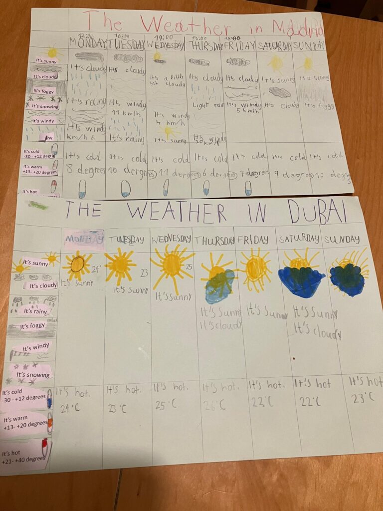 Im Rahmen unseres Weather Projects wählte jedes Kind eine Stadt auf der Welt aus und dokumentierte eine Woche lang das Wetter, das anschließend der Klasse präsentiert wurde. Es war spannend zu sehen, wie unterschiedlich das Wetter weltweit ist.